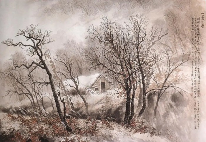 为创作出版《一曼小屋》曾两次在零下30多度的严冬到黑龙江尚志县春秋岭这个抗日女英雄曾经生活和战斗过的地方实地写生。每次都要踏着四五十厘米深的雪,跋涉五六公里的路程。在这幅作品中,巧妙地留白营造了朦胧远山,皑皑白雪,一派北国风光。一片杂树林,一间茅草屋,看似平凡却清冷高贵。