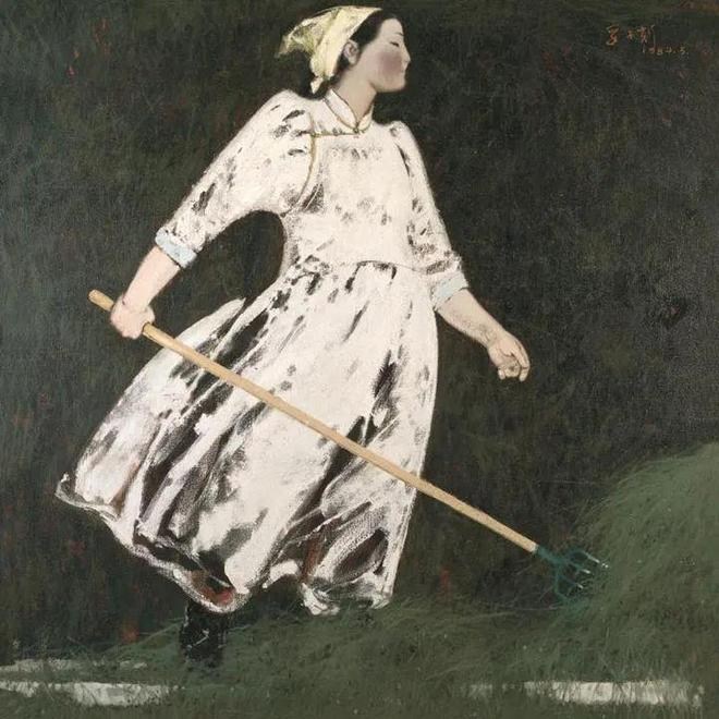 紧随展览之后,1980年代至1990年代,妥木斯进入了其艺术成果出版的高峰期。其中,1984年创作并参展的《垛草的妇女》成为其艺术成就的巅峰象征,也是其出版生涯中最具代表性的作品之一。该作品在第六届全国美展荣获银奖,并被中国美术馆收藏,随后通过画册、美术教材、专业期刊等多种渠道反复出版、发表,深入人心。在这幅作品中,他创造性地将中国传统绘画的“大写意”精神融入油画语言:以极为简练、概括的线条勾勒出垛草间歇的蒙古族妇女健硕而优美的形体轮廓;面部刻画惜墨如金,仅施以微妙色彩便生动传达出人物沉静而坚韧的神态;背景处理挥洒自如,强调黑、白、灰的节奏与色块对比,画面整体气势恢宏,意境悠远。《垛草的妇女》的成功,不仅在艺术上完美体现了其“似与不似之间”、“无过无不及”的美学追求,更通过广泛的出版与传播,清晰地向学界和公众展示了“内蒙古草原画派”(或称“草原画派”)的典型风格与美学特质,妥木斯也因此被公认为这一画风的开拓者和领军人物。