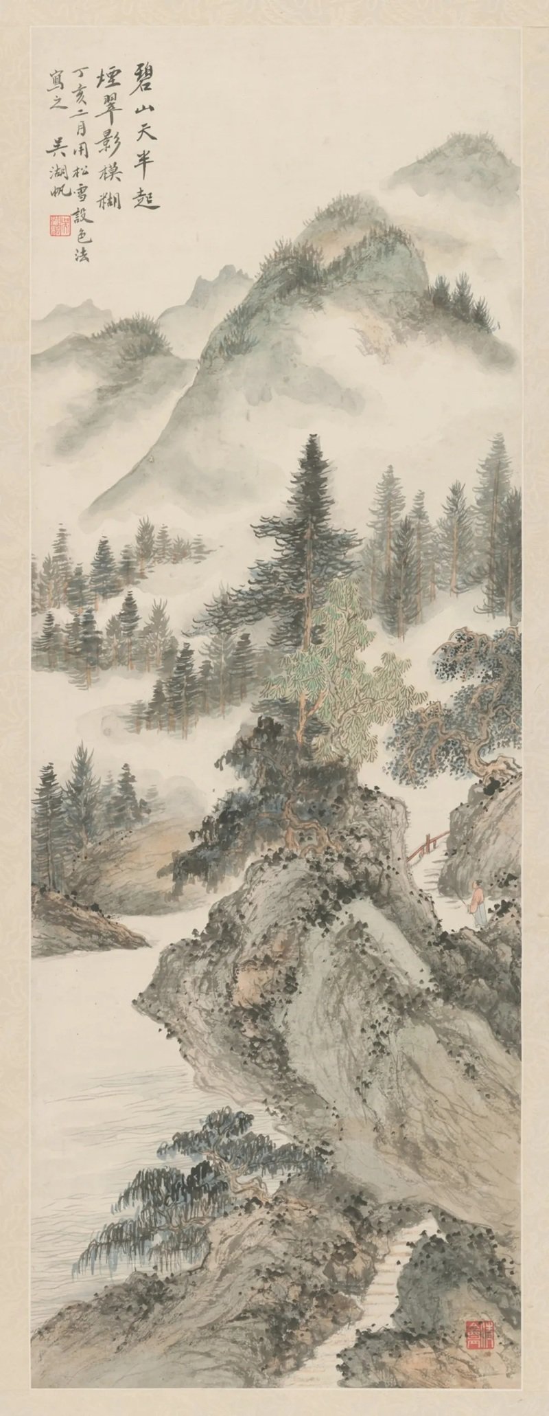 当时中国山水画创作新旧并立、中西交融,出现画派林立的局面。新金陵画派旗手傅抱石与钱松岩、宋文治、亚明、魏紫熙等同仁,以现实主义笔触描绘祖国山河新貌;海上画派的吴湖帆以其清丽雅正、融汇南北的「吴装山水」,展现传统文人画的精致与深邃;贺天健以严谨的法度和雄强的笔力,彰显海派山水的骨气与格局。